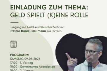 Umgang mit Geld aus biblischer Sicht mit Pastor Daniel Dallmann aus Lörrach Samstag 09.05.2026 17:00 Uhr 1. Vortrag / 18:00 Uhr Gemeinsames Abendessen / 19:00 Uhr 2. Vortrag